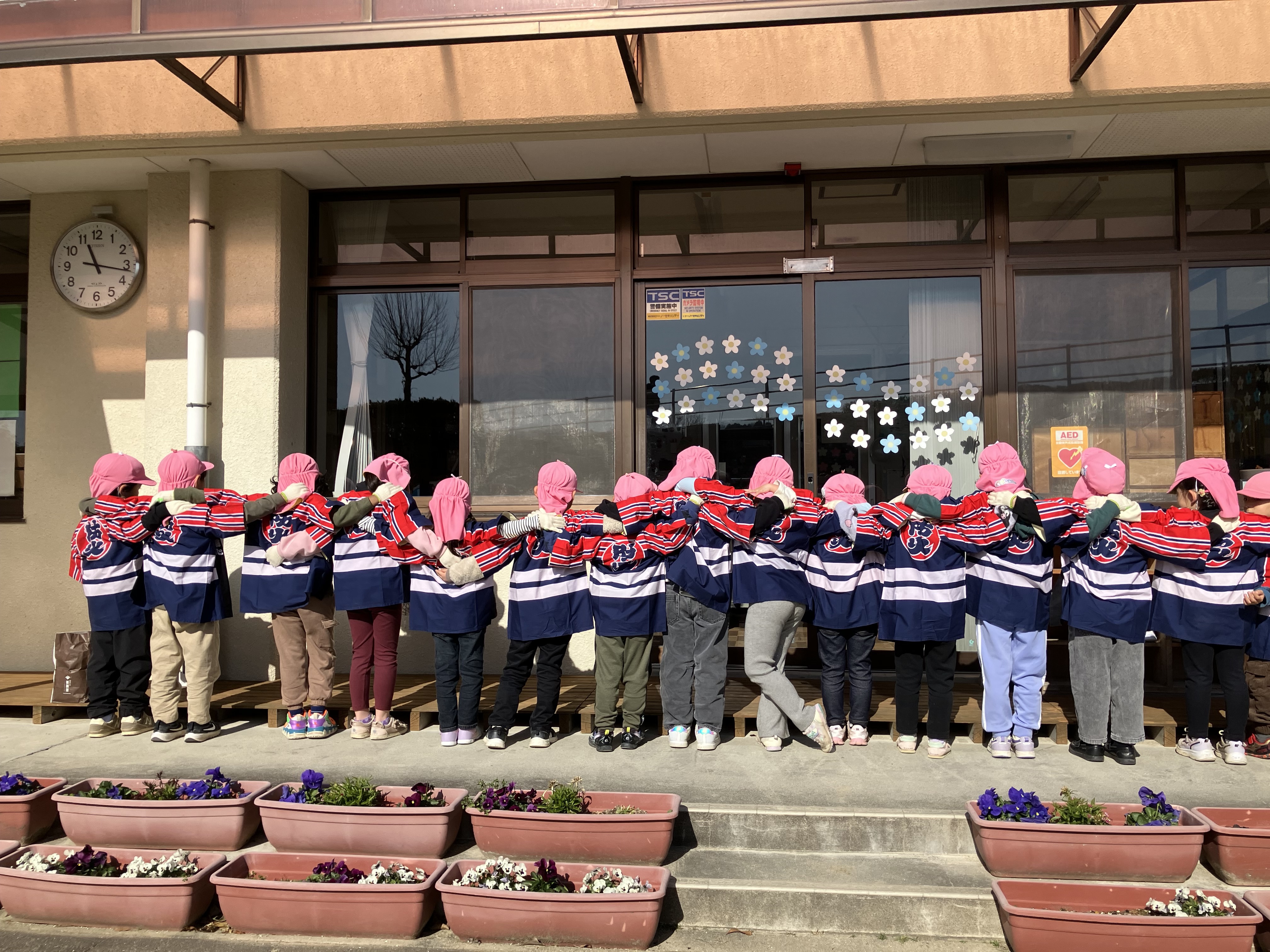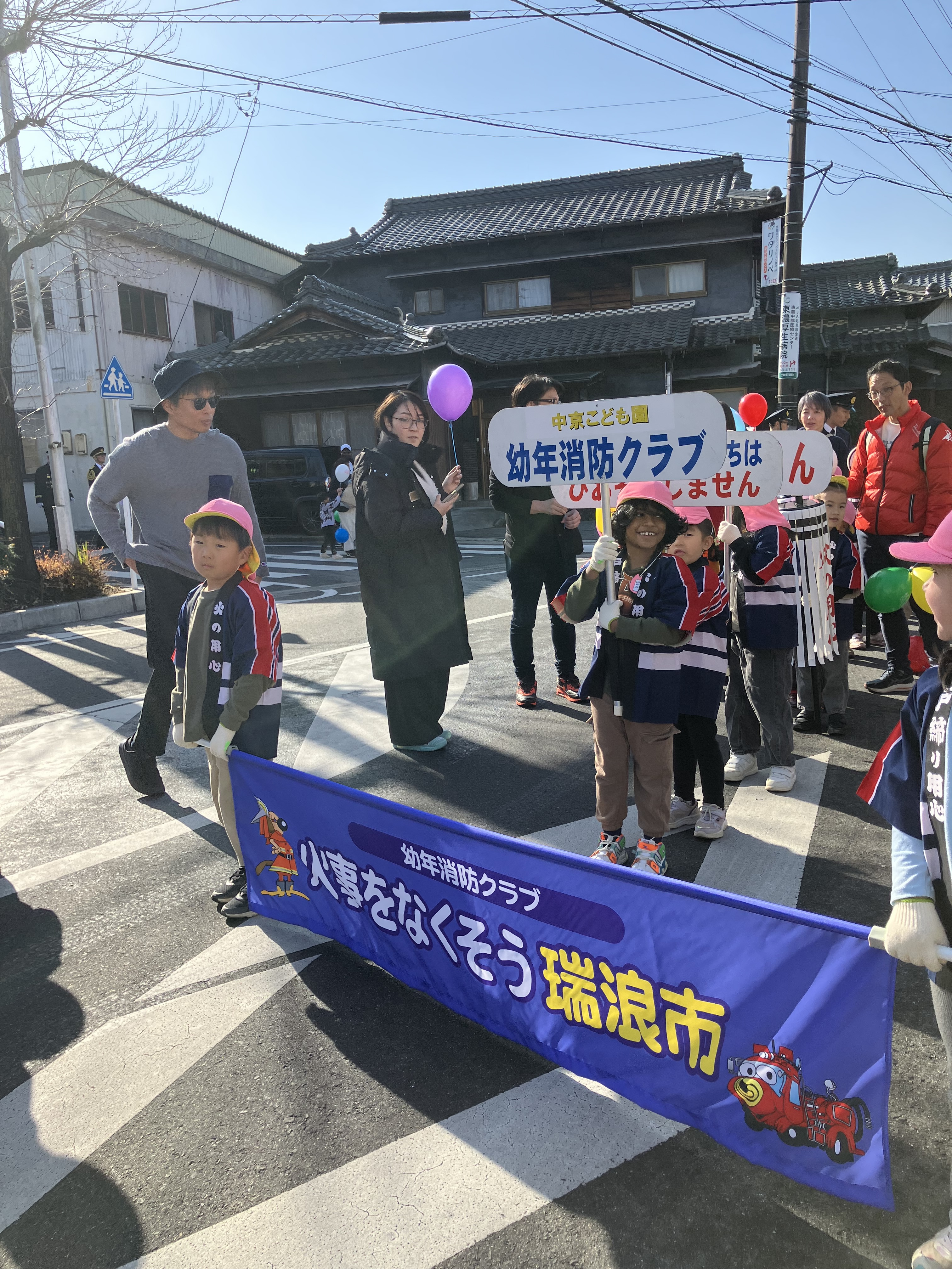 1月18日(日)に5歳児の希望者を対象に幼年消防クラブの防災パレードを行いました。市内の消防士、消防団員の皆さんが歩くパレードの先頭に立ち、歩きました。合言葉は『火事をなくそう瑞浪市、みんなで守ろう火の用心』です。パレードに参加することになり、事前に消防署に伺ったり、消防士さんに来てもらい、リハーサルや動画撮影をしたりと取り組んできました。その成果をたくさんの人に見ていただくことができました。今後も、中京こども園5歳児が幼年消防隊として、火災防止の為の活動を行っていきたいと思います。