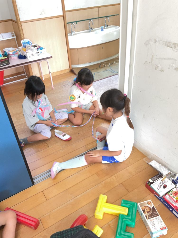 友達が食べる様子を見て、「早くおいでよー。」「待ってるねー。」と気にしながらも、食事に区切りを付けて、遊びに夢中になる姿がありました。指先を使ってスズランテープを三つ編み。 作品を自分の髪や、胸元に飾りつけポーズをとって見せてくれました✨ ”自分で選択した時間を過ごせる”嬉しさや喜びが大きく、いつもは「もうお片付け?」という声が上がることも多いのですが、今日は「楽しかった!」と満足げに笑う子ども達でした😊 「ねえ、次のラッキーデーはいつ?」と終わった瞬間から、次の機会を心待ちにする姿がありました。
